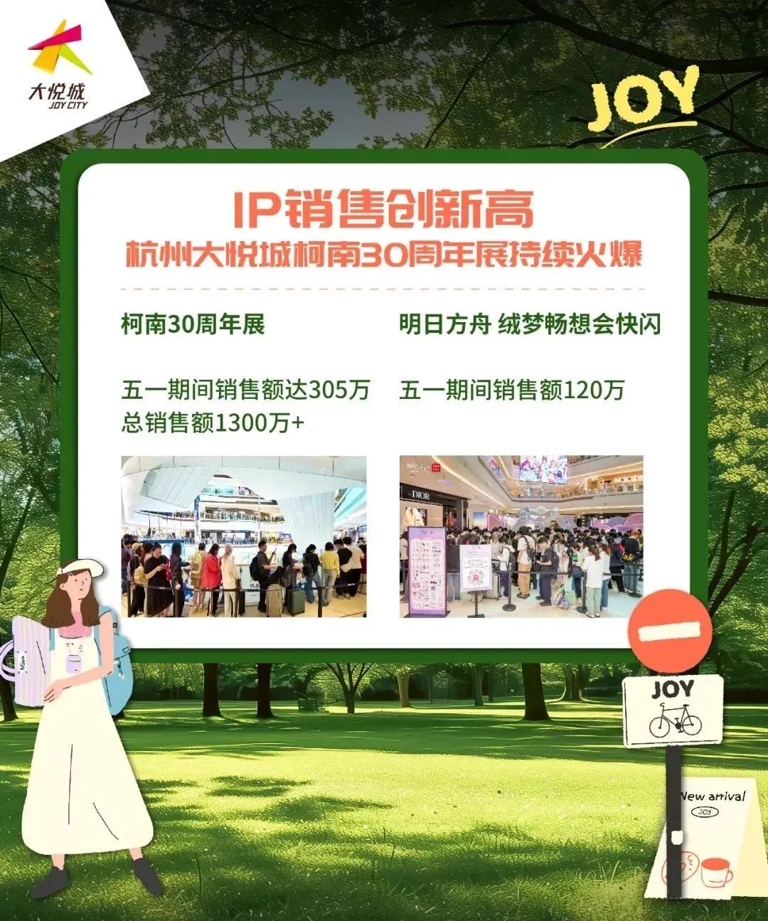 其中,“名侦探柯南30周年纪念展”五天销售额达305万元,4月18日开展以来仅18天的总销售额已超过1300万元;明日方舟联动名创优品的“绒梦畅想会”快闪5天销售额突破120万元。打造张杰北京快闪、FARMERBOB首个情绪系列快闪等7场快闪的朝阳大悦城“五一”期间客流同比提升10%。