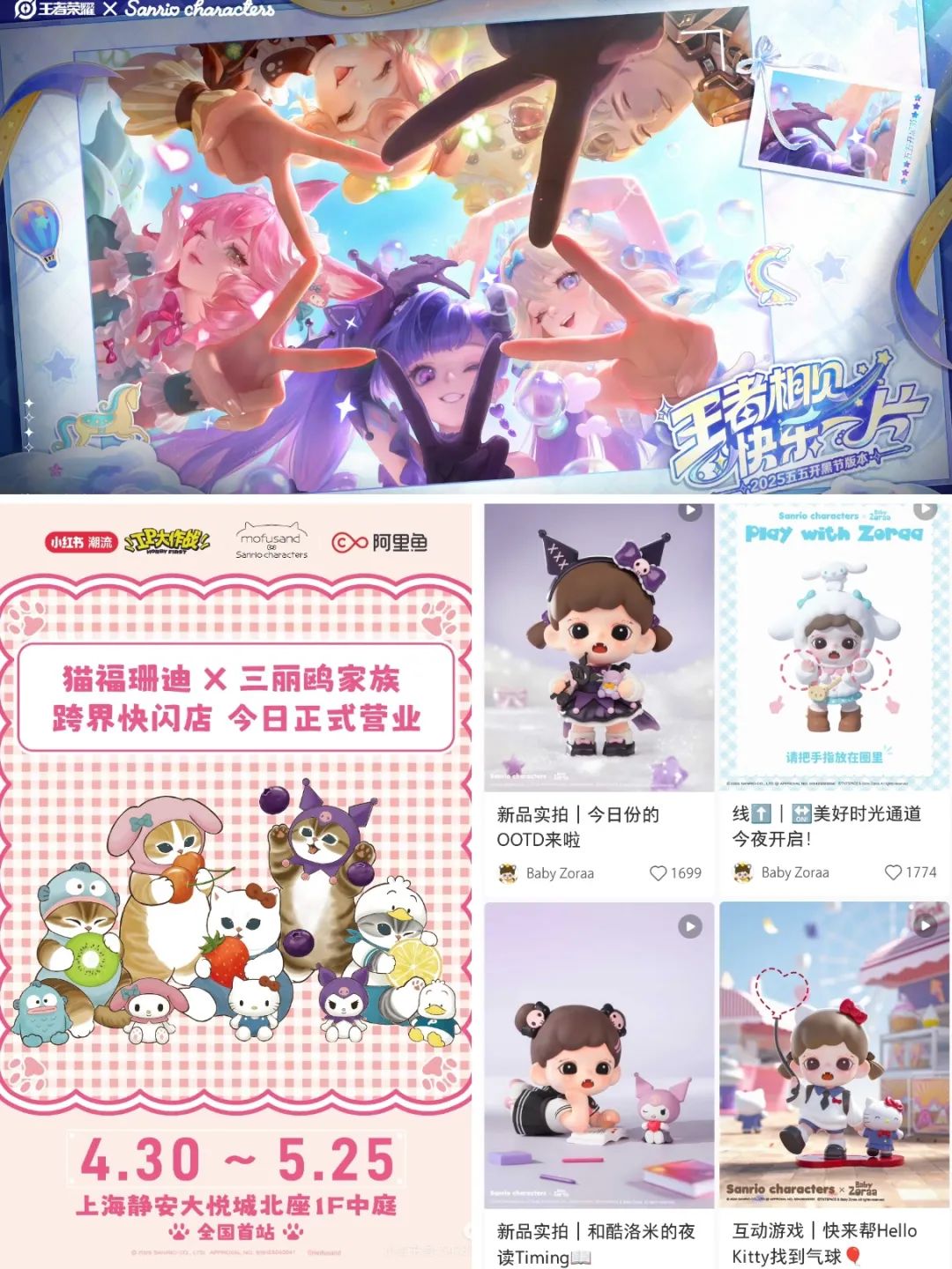 头部IP之间的联名及快闪受到欢迎。例如,阿里鱼运营的“三丽鸥家族”就在五一期间联动了“猫福珊迪”在上海静安大悦城启动了双IP跨界快闪。同期,“三丽鸥家族”还与B站的头部国创IP“时光代理人”合作,推出系列周边并在杭州、北京、武汉三城推出主题餐厅。今年以来,除了上述合作,“三丽鸥家族”还相继与“Zoraa”“卓大王”“第五人格”“王者荣耀”等不同类型的IP推出联名周边,并取得不错的市场反馈。