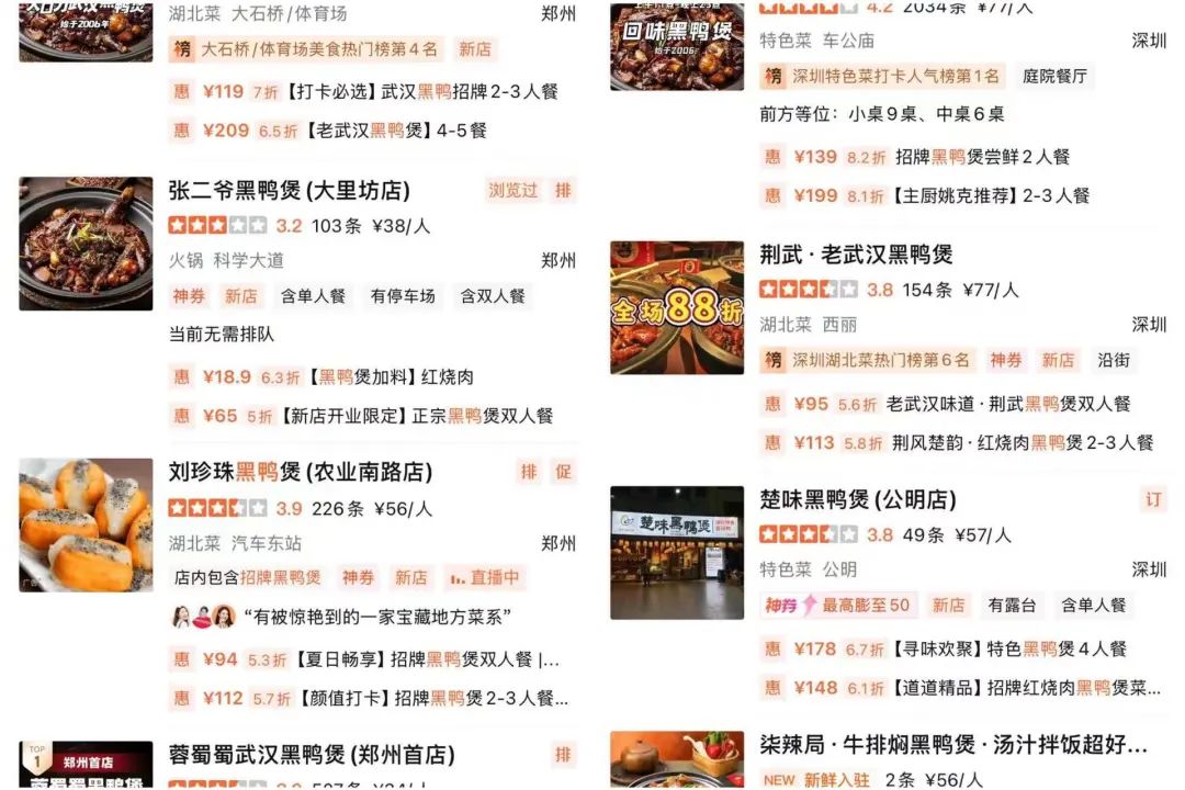 而在武汉之外,全国其它地区也出现了一批黑鸭煲门店。比如,上海有鸭仙客黑鸭煲、翘兰汁·酱烧黑鸭煲;深圳有荆武·老武汉黑鸭煲、楚味黑鸭煲、鸭发发·武汉黑鸭煲;苏州有蕉蕉啫·回味黑鸭煲、赞牛匠黑鸭煲;在郑州,则出现了大口力 武汉黑鸭煲、刘珍珠黑鸭煲、蓉蜀蜀武汉黑鸭煲、张二爷黑鸭煲、真味黑鸭煲、潮煲煲武汉黑鸭煲等。