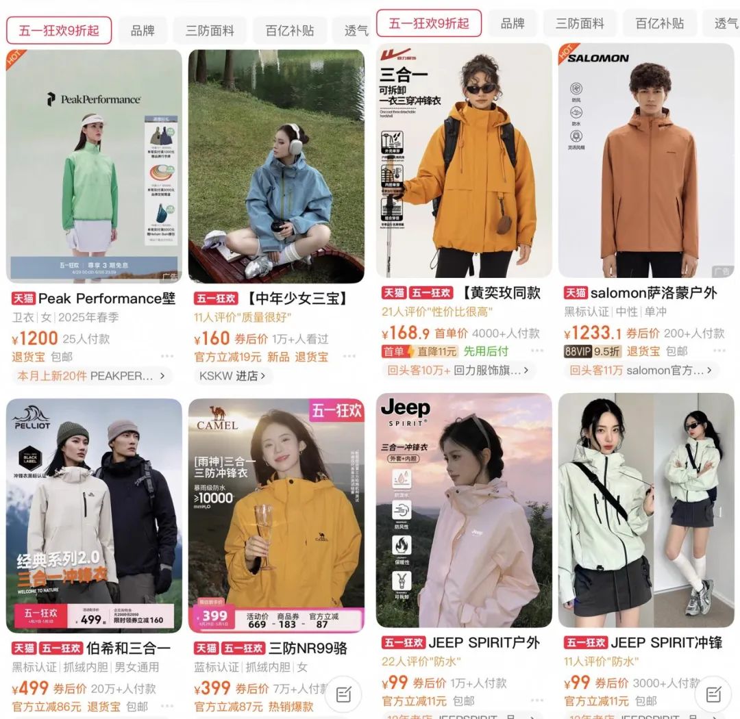 3月,品牌们集体上架防晒衣,用“抗紫外线”“冰凉触感”关键词争夺开季流量;8-9月,大家又默契转向冲锋衣,比拼防水指数和轻量化设计。同一个单品的竞争非常激烈,所有人都卡着时间点备货,导致换季尾声必然出现卷低价、卷折扣的现象。