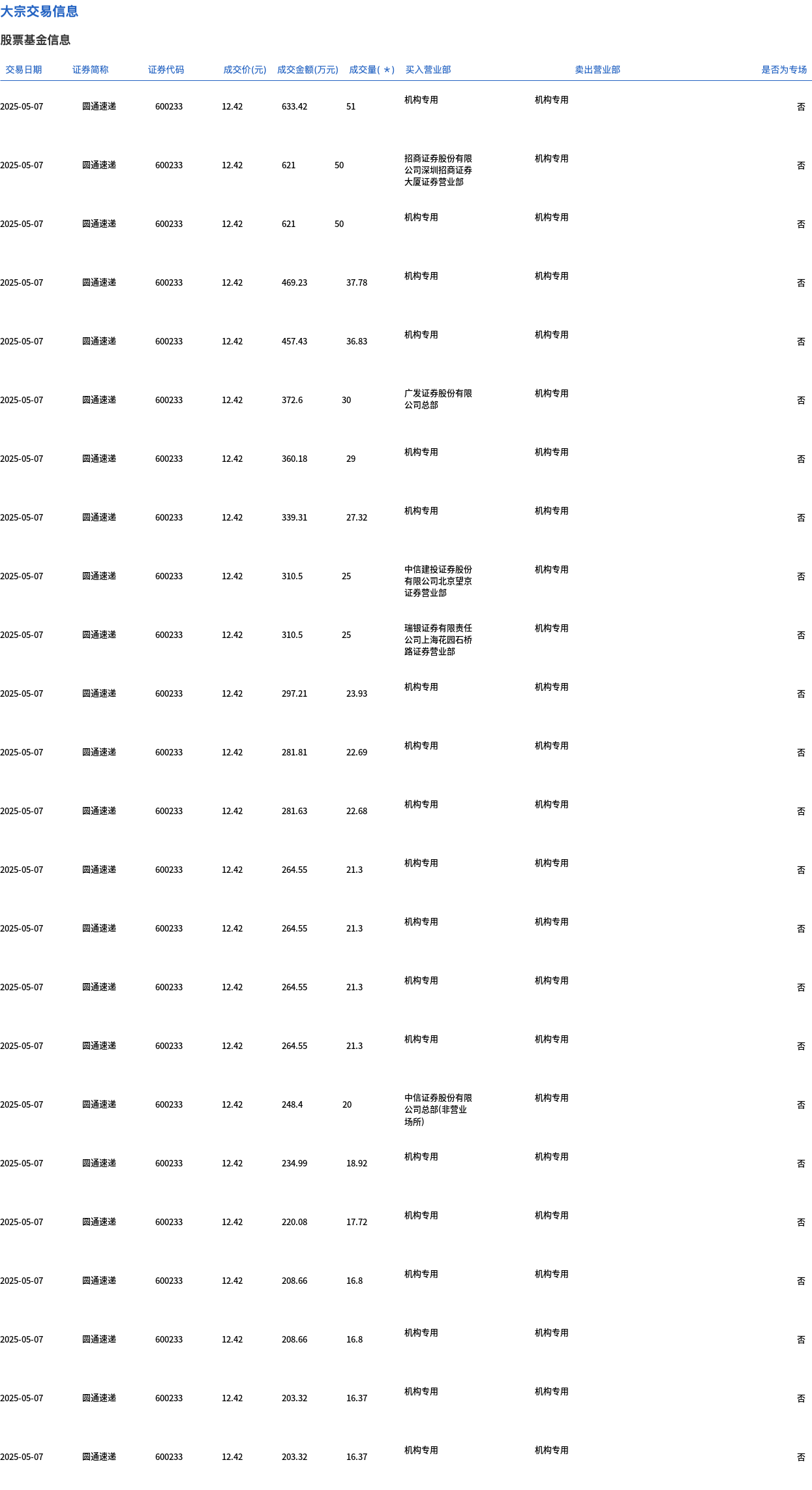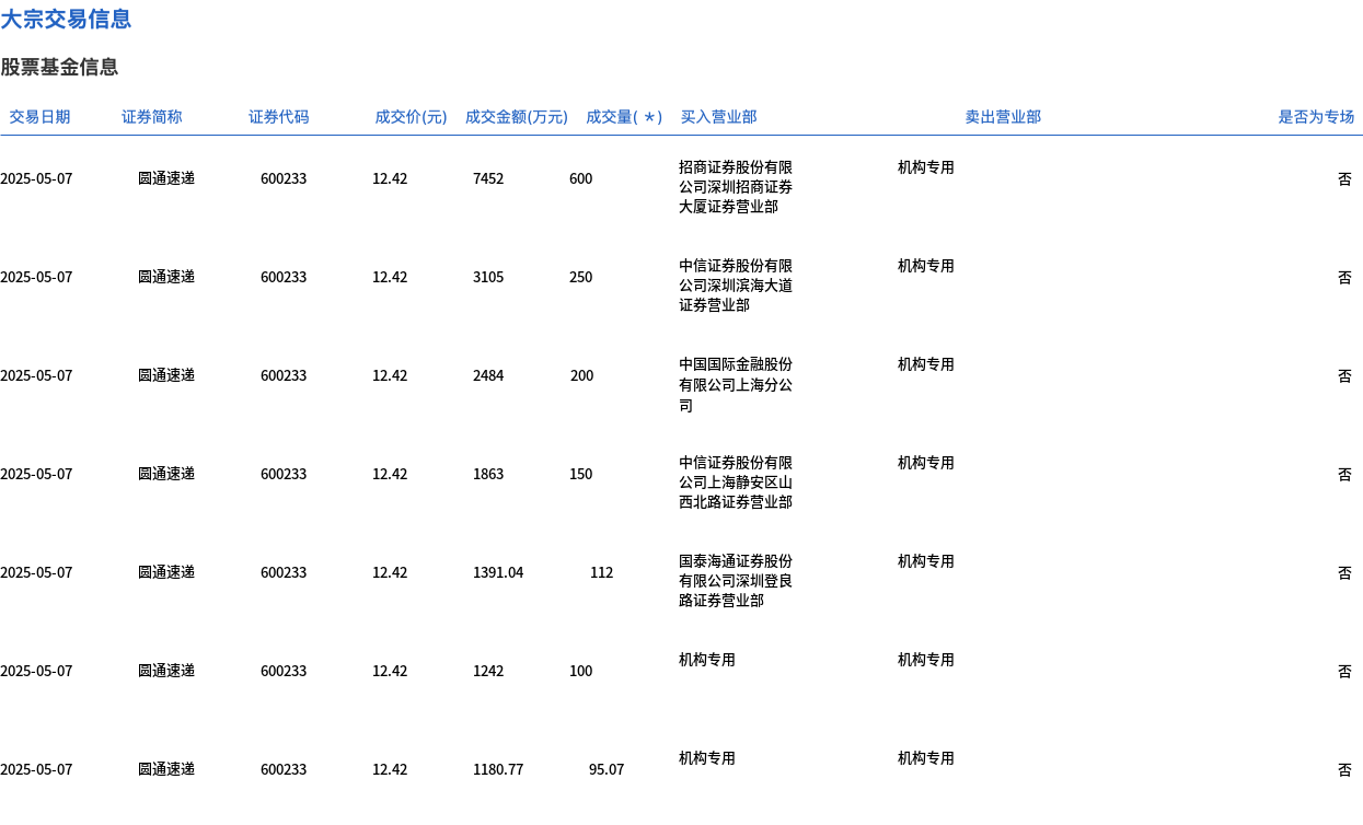 5月7日,圆通速递大宗交易成交2146.48万股,成交额2.67亿元,占当日总成交额的53.09%,成交价12.42元,较市场收盘价13.21元折价5.98%。
