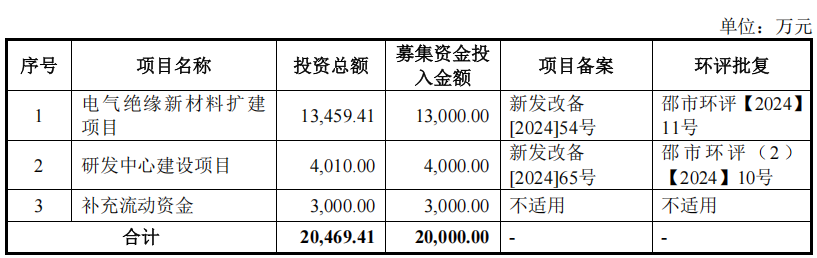 招股书显示,此次IPO广信科技计划募资2亿元,分别用于电气绝缘新材料扩建项目、研发中心建设项目及补充流动资金。