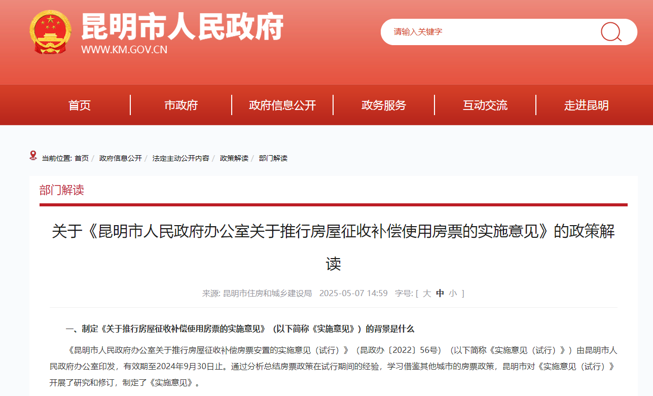 5月7日,昆明市人民政府办公室发布《关于推行房屋征收补偿使用房票的实施意见》(以下简称《实施意见》)。