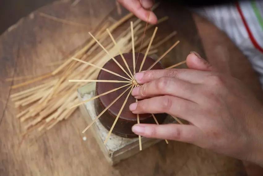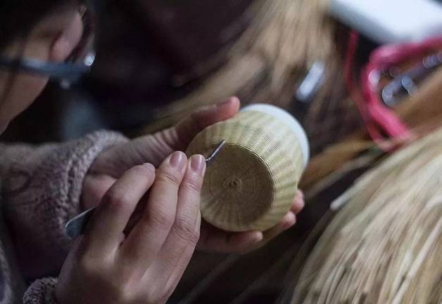 好的技艺拼的就是精细度和与瓷胎的贴合度,竹丝通过匀刀一刀刀刮成,根据瓷胎的形状起伏,每根竹丝厚薄也需有相应的薄厚变化,竹丝之间的接头部分要藏而不露,手艺人最爱挑战的是插入染色的竹丝编出图画来,梅兰竹菊、古代仕女、书法文字,还有同样靠竹生存的大熊猫,在半个拳头大小的瓷胎上也能从容不迫。