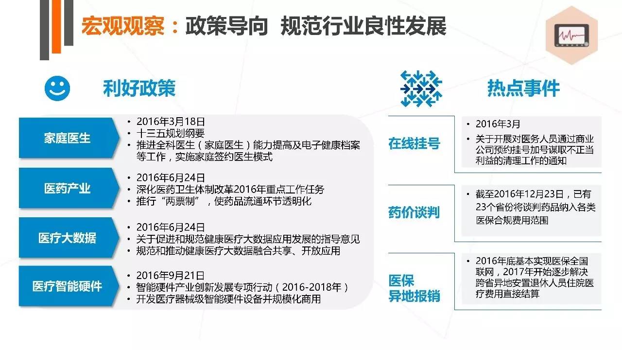 2016 年是十三五规划的开局之年,为了响应「健康中国」战略,国家出台了许多政策,来规范行业良性发展。国家出台十三五规划纲要,推进全科医生的发展,针对医药行业进行药品流通环节透明化,对中医药推广力度加强,出台促进规范健康医疗大数据的发展指导意见,并对智能医疗硬件有更明确的规范,让医疗智能硬件设备在未来规模化商用。
