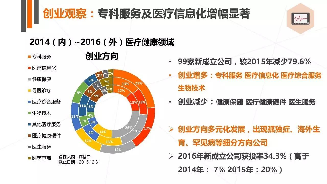 根据 IT 桔子观察,医疗健康领域获投趋势与创业趋势相吻合,获投领域集中在专科服务、医疗综合服务和医疗信息化。获投趋势减少的领域是保健健康、寻医问诊、医疗健康硬件等。