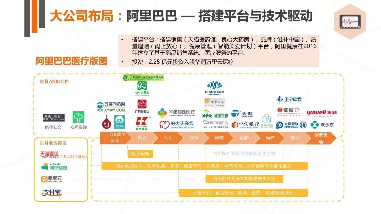另外,阿里健康通过收购中信 21 世纪获得的中国药品电子监管网于 2 月被国家食药监总局暂停,随后,阿里健康重新于 6 月推出第方药品信息追溯平台「码上放心」。此外,阿里还推出了「滋补中国」滋补品品牌,联合智能硬件公司推出智能关爱计划,以上是阿里健康在 2016 年建立的基于药品销售系统、医疗服务的平台。