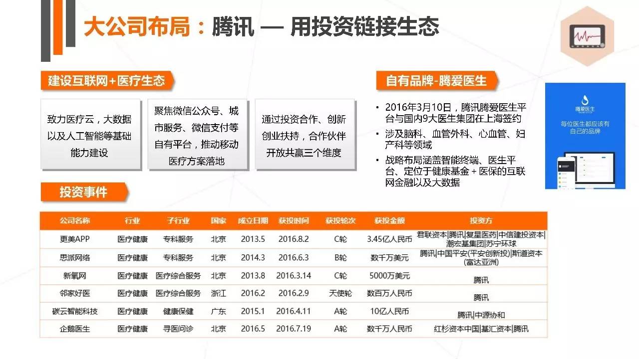 另外腾讯 2016 建立自有品牌腾爱医生,与国内九大医生集团签约,涉及脑科、血管外科、心血管、妇产科等领域。