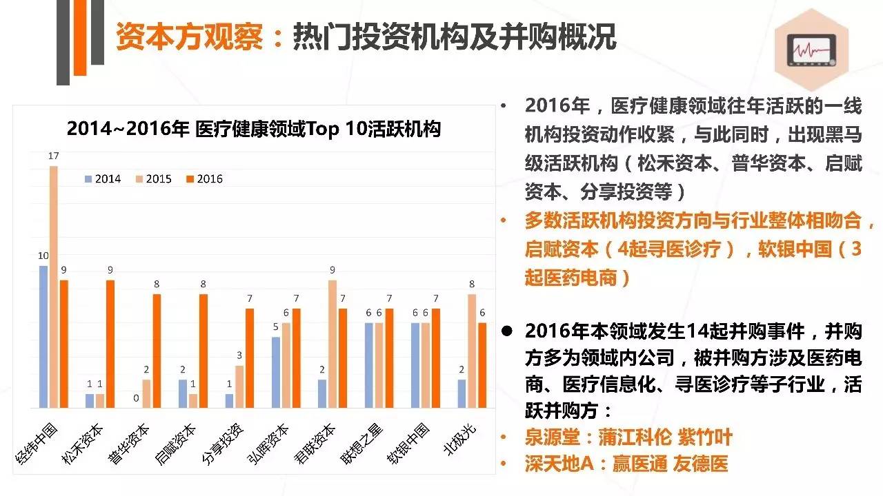 在投资方向上,大部分机构的投资方向仍与整个行业趋同,专注投资在专科服务或者生物制药领域,启赋资本及软银中国则分别侧重于寻医诊疗及医药电商赛道。在并购事件上,2016 年医疗健康领域共发生 14 起并购,并购目的多为丰富公司业务布局,2016 年活跃的两个并购方是泉源堂、深天地 A。