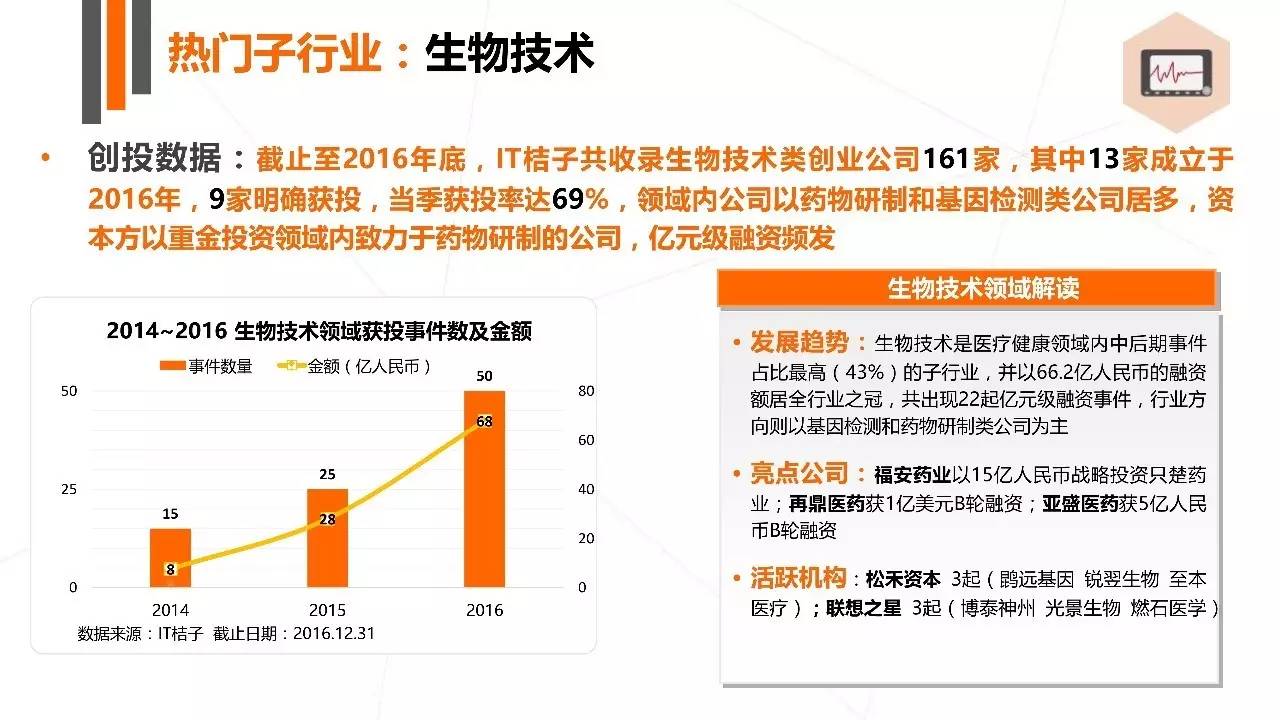 IT 桔子根据对投融资事件、创业公司等信息的持续跟踪,综合整理了 2016 医疗健康创业投资盘点报告。