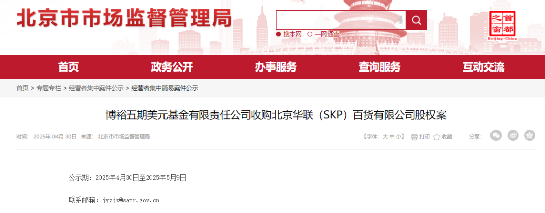 日前,北京市场监督管理局发布公示《博裕五期美元基金有限责任公司收购北京华联(SKP)百货有限公司股权案》称,博裕五期美元基金(下称博裕基金)通过其关联方拟收购北京SKP部分股权,目前尚未公布交易金额。