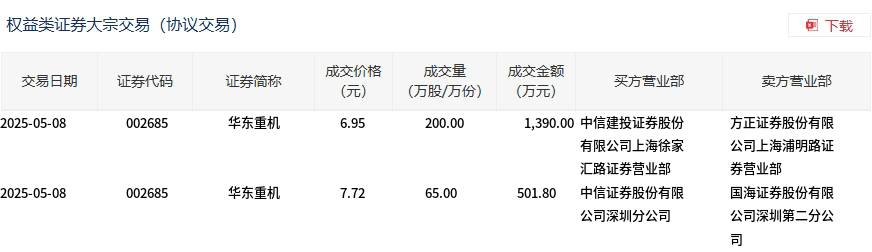 5月8日,华东重机大宗交易成交265万股,成交额1891.8万元,占当日总成交额的2.4%,成交均价7.14元,较市场收盘价7.72元折价7.53%,其中最高成交价7.72元,最低成交价6.95元。