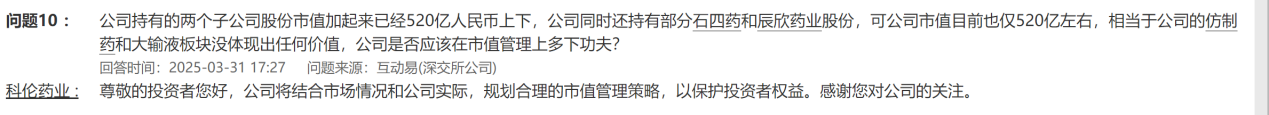 就此,有投资者对科伦药业提问,为何子公司的市值高于科伦药业,但公司并没有正面回答,仅表示将结合市场动态,规划合理的市值管理策略,以保障投资者权益。