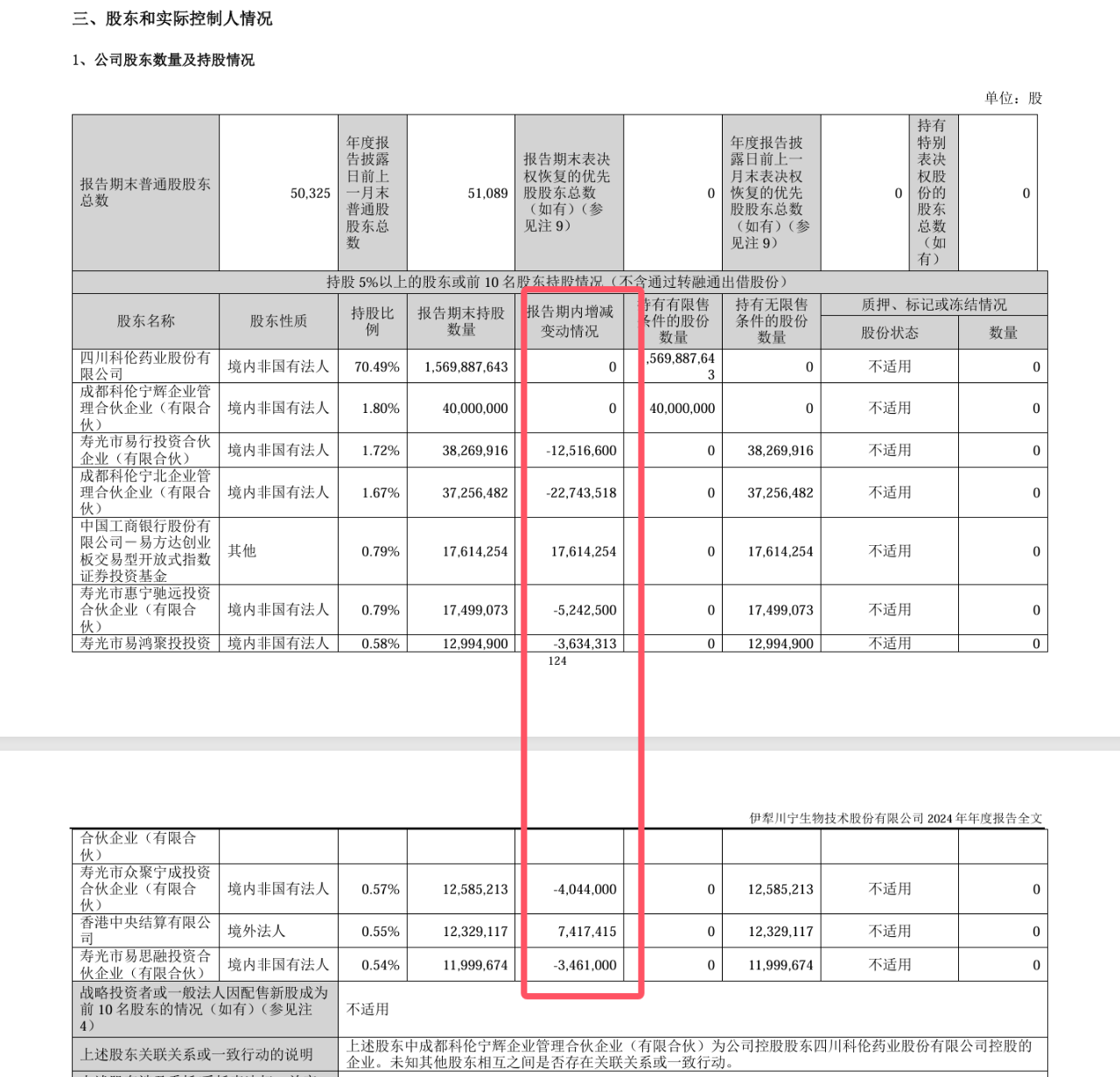 资本的嗅觉更为灵敏。2024年财报中,川宁生物的前十大股东中,寿光市易行投资、寿光市惠宁驰远投资等多家资本减持了川宁生物的部分股票,这种减持行为或暗示着市场对其未来业绩增长的担忧。