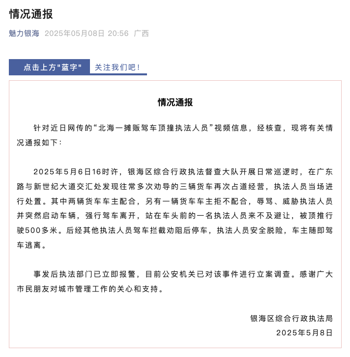 5月8日,广西北海银海区综合行政执法局针对近日网传的“北海一摊贩驾车顶撞执法人员”视频信息发布情况通报:经核查,5月6日16时许,银海区综合行政执法督查大队开展日常巡逻时,在广东路与新世纪大道交汇处发现往常多次劝导的三辆货车再次占道经营,执法人员当场进行处置。其中两辆货车车主配合,另有一辆货车车主拒不配合,辱骂、威胁执法人员并突然启动车辆,强行驾车离开,站在车头前的一名执法人员来不及避让,被顶推行驶500多米。后经其他执法人员驾车拦截劝阻后停车,执法人员安全脱险,车主随即驾车逃离。事发后执法部门已立即报警,目前公安机关已对该事件进行立案调查。