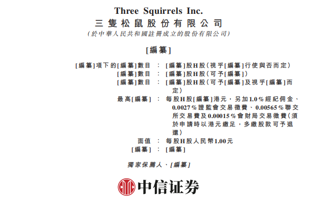 4月25日,港交所官网显示,三只松鼠已正式向港交所提交招股说明书,中信证券担任独家保荐人。