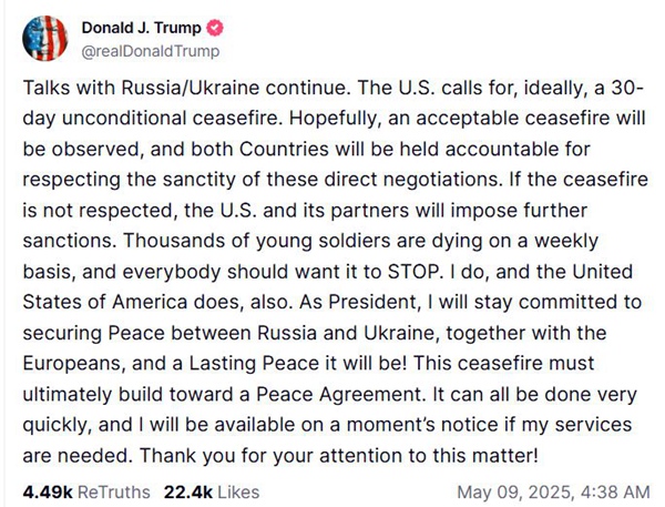 特朗普也在社交媒体发文,敦促俄乌进行30天无条件停火。特朗普称美国正在继续与俄乌双方谈判,宣布他将致力于“与欧洲人共同”确保俄乌持久和平。