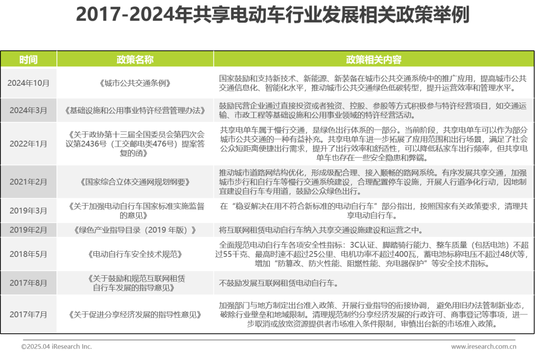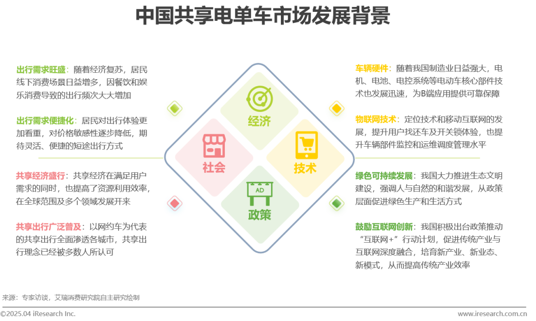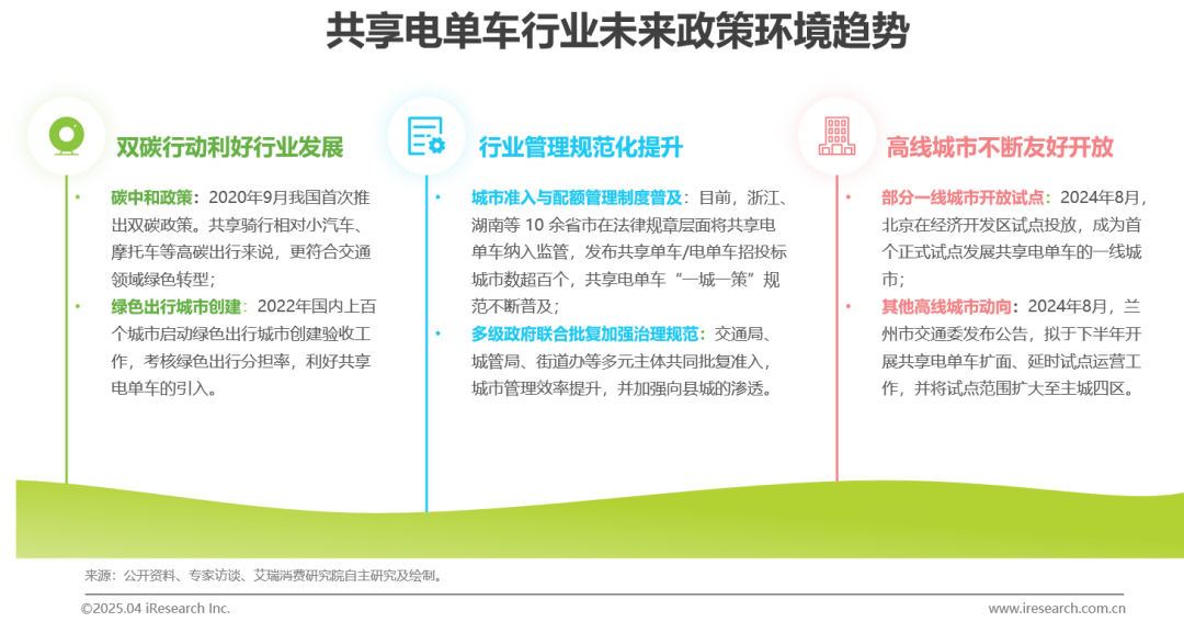 2025年《政府工作报告》指出,要纵深推进全国统一大市场建设。加快建立健全基础制度规则,破除地方保护和市场分割,打通市场准入退出、要素配置等制约经济循环的卡点堵点,这将为共享电单车行业提供更加明确和统一的市场准入标准。