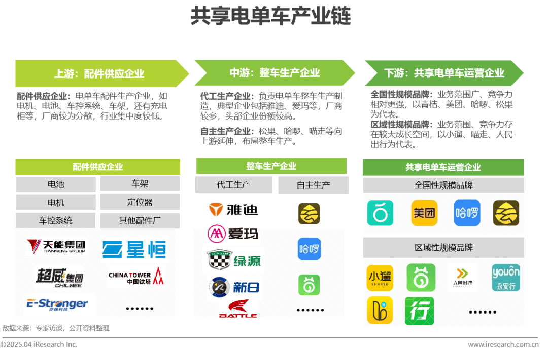 共享电单车产业链分为上游、中游和下游。上游为电动自行车部件生产企业,包括电装部件制造商、车体及标准件制造商、随车附件制造商。中游包括整车代工生产企业和自主生产企业。下游为共享电单车运营企业。