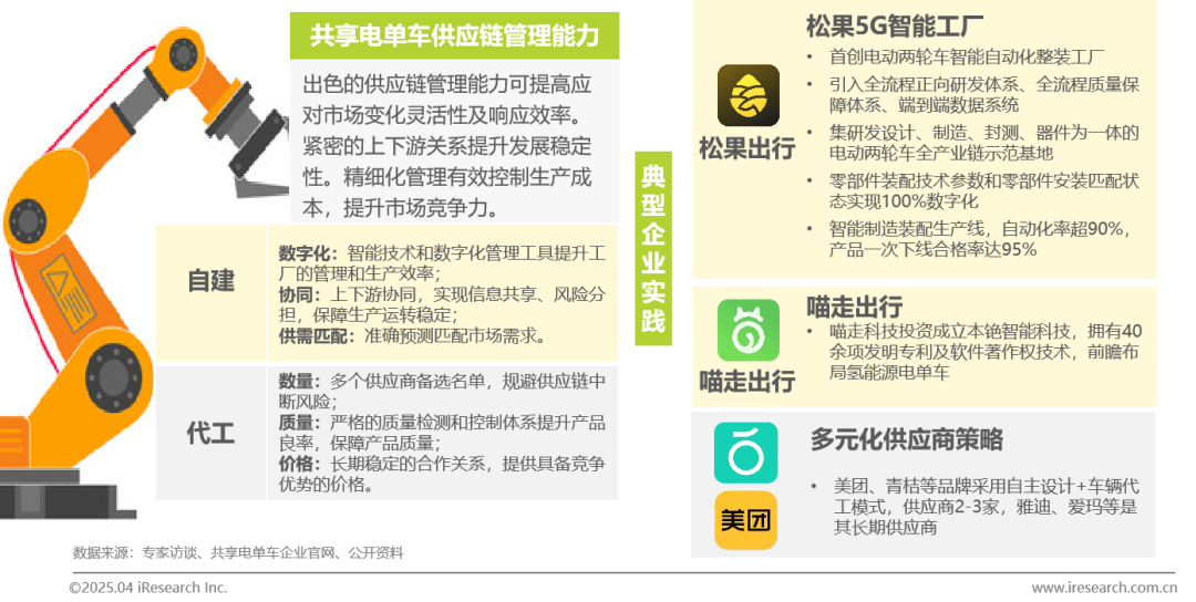 有效的供应链管理有利于保证产品稳定生产,提升应对市场变化的速度,增强灵活性。当前,松果通过自建5G智能工厂的方式向行业中上游延伸,形成了一个覆盖产品全生命周期且高效协同、数字化的供应链体系。而青桔、美团等企业则采用自主设计+生产代工的方式,与产业链生态伙伴开展紧密合作,共同提升产品质量和供应链效率。