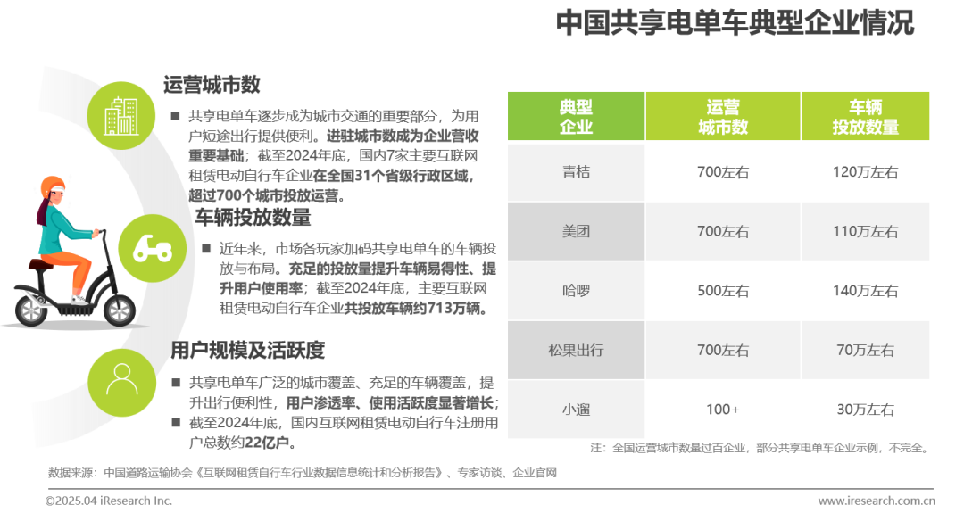 对于共享电单车企业而言,运营城市数、车辆投放数量、用户规模及活跃度,决定业务市场规模,是企业竞争力的直接体现。整体来看,随着城市政策日益友好、企业布局及资本投入,共享电单车在全国范围内覆盖逐步提升、用户体量不断增长。以青桔、美团、哈啰、松果出行为代表的头部玩家快速覆盖市场,在赋能城市公共交通的同时,不断提升自己的竞争力。