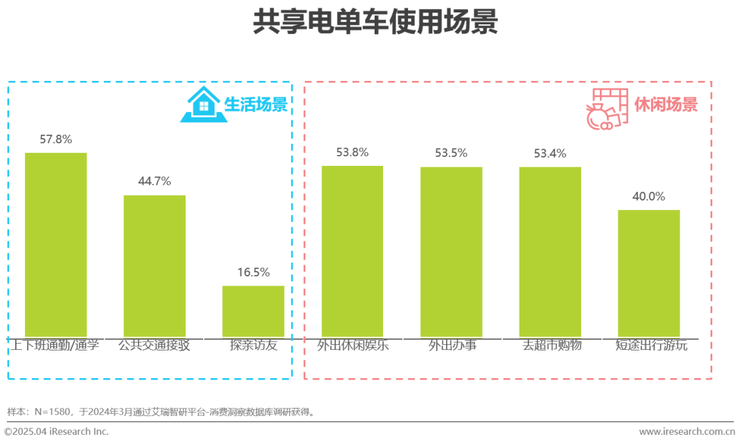 共享电单车最常见出行场景包括上下班、外出休闲娱乐、办事/购物