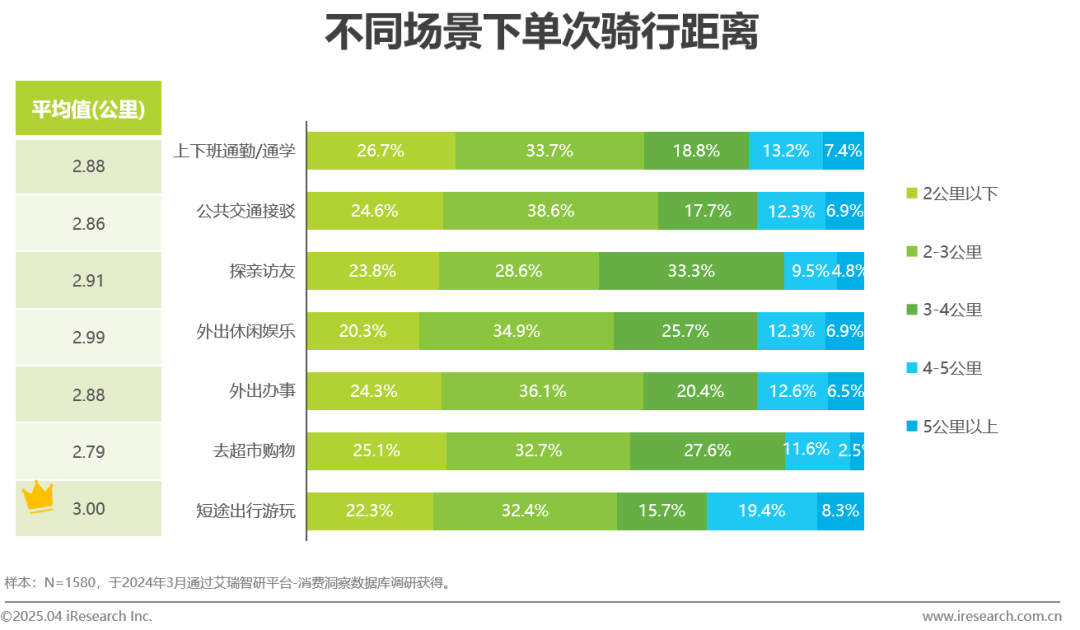 共享电单车有效满足了用户中短途出行需求,单次骑行距离多在4公里以下,单次骑行距离均值2.91公里。细分出行场景来看,短途出行游玩的骑行距离最长,达到3.0公里,其次是外出休闲娱乐、探亲访友,出行行为受到用户的消费习惯、居住地分布影响。