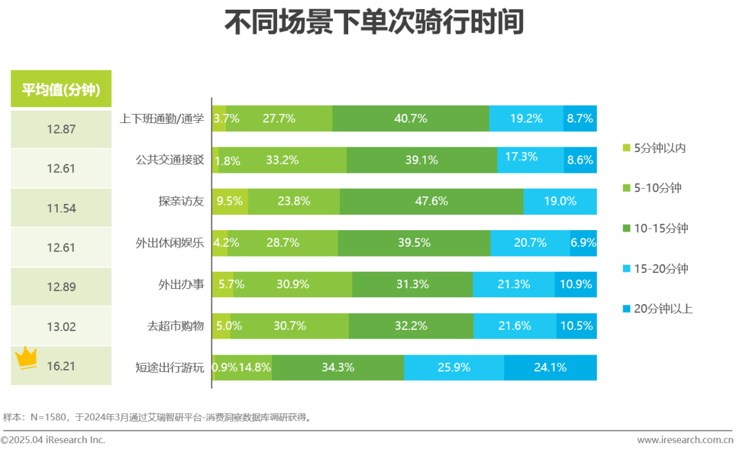 整体看,用户单次骑行时间集中在15分钟以下,骑行时间均值13.1分钟。细分出行场景来看,短途出行游玩的骑行时间最长,达到16.21分钟,其次是较为常见和高频的去超市购物、外出办事等场景,单次骑行时间在13分钟左右。