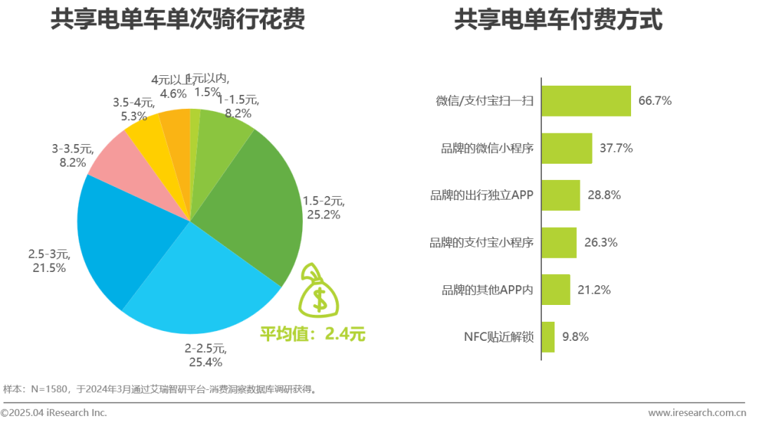 单次骑行花费集中在1.5-3元之间,用户习惯通过微信/支付宝付费
