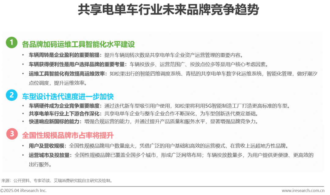 在共享电单车领域,车辆获得便利性、硬件吸引力(新车型、新投车或次新车等)是影响用户选择的重要因素。随着各地管理政策的完善,企业的竞争重点经历了从“铺量”和“低价”,到以提升运营效率和硬件体验的转变。全国性规模品牌在用户及营收规模、运营城市数量、投放量上优势明显,市场占有率将进一步提升。