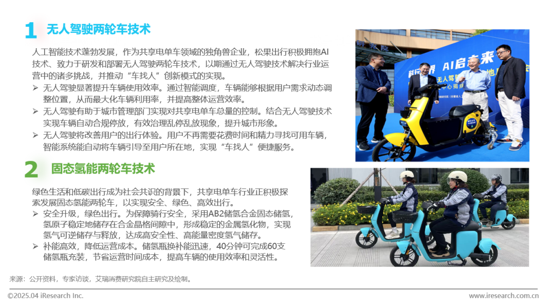 2025年《政府工作报告》指出,要培育壮大新兴产业、未来产业,深入推进战略性新兴产业融合集群发展,支持独角兽企业、瞪羚企业发展,让更多企业在新领域新赛道跑出加速度。面对城市管理要求趋向精细化,用户共享电单车使用需求日益多元化,共享电单车行业正运用新技术提出创新解决方案。通过发展无人驾驶技术和固态氢能技术,提高车辆的使用效率,满足用户的多元化需求,为城市交通的绿色、可持续发展做出积极贡献。