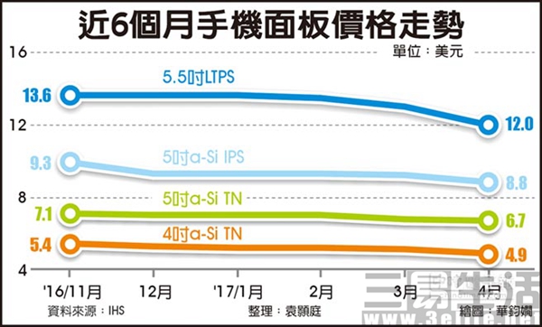 但是在2017年,春天终于来了!今天,IHS发布报告,表示第一季度手机面板价格已经产生下滑,4-5.5寸LTP和Sa-Si面板跌幅普遍为10%左右,并且他们还预期,第2季跌幅可能扩大到20%以上。而下跌的原因也非常简单,现在的手机面板产量过剩,累积了过多的库存。