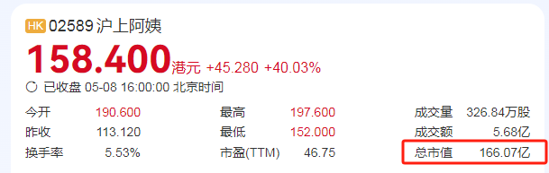 沪上阿姨(02589.HK)发行股价为113.12港元/股,开盘大涨,股价一度暴涨68%,市值超190亿港元。截至港股当日收盘,涨幅回落至40.03%,股价定格在158.4港元/股,总市值为166.07亿港元。