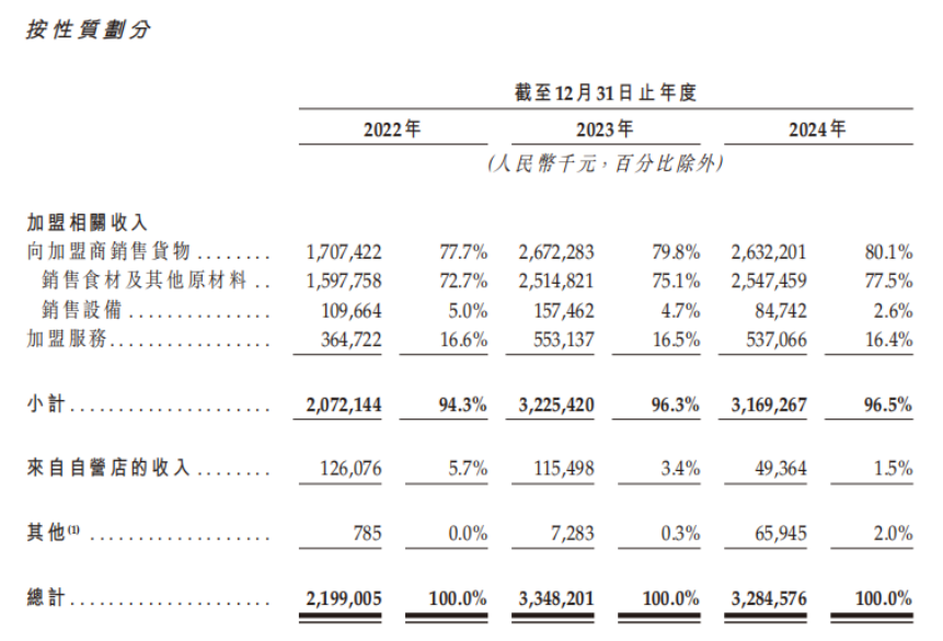 其中,向加盟商销售货物,包括销售食材、原材料、设备等,收入占比为80.1%;而加盟服务费占比为16.4%,二者合计贡献了96.5%的营业收入。