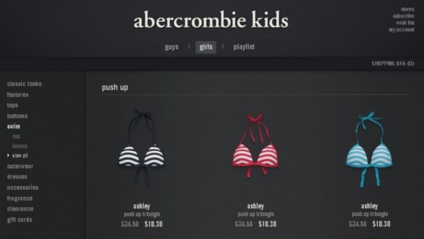 也有的品牌把本该天真无邪的孩子们摆在了成人消费者的位置。前几年生意不错的美国服装品牌Abercrombie & Fitch走的一直是性感路线,他们在美国市场的主要目标人群就是青少年。2011年Abercrombie & Fitch推出了一款面向8-12岁儿童的比基尼,还带着厚厚的有提升罩杯功能的胸垫。这款和成年人比基尼无异的套装一推出就引起了家长们的反感,更有心理学家指出,穿和年龄不符的聚拢内衣容易导致女孩们的性早熟。