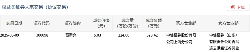 高新兴今日大宗交易平价成交114万股,成交额573.42万元