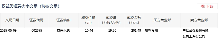 群兴玩具今日大宗交易平价成交19.3万股,成交额201.49万元