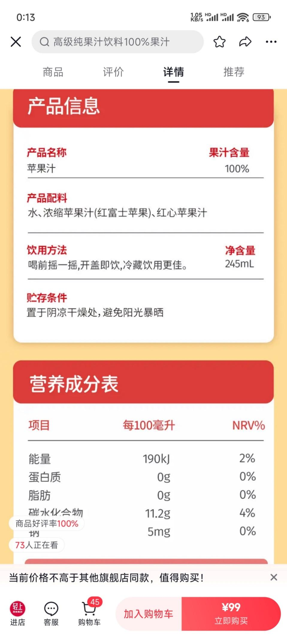 「创业最前线」发现,在轻上100%苹果汁产品的营养成分表中,每100ml含糖量高达11.2g,以每罐245ml计算,一罐含糖量达到27.44g,这也就意味着,一天喝一罐轻上苹果汁,就已经摄入当日二分之一的糖量。