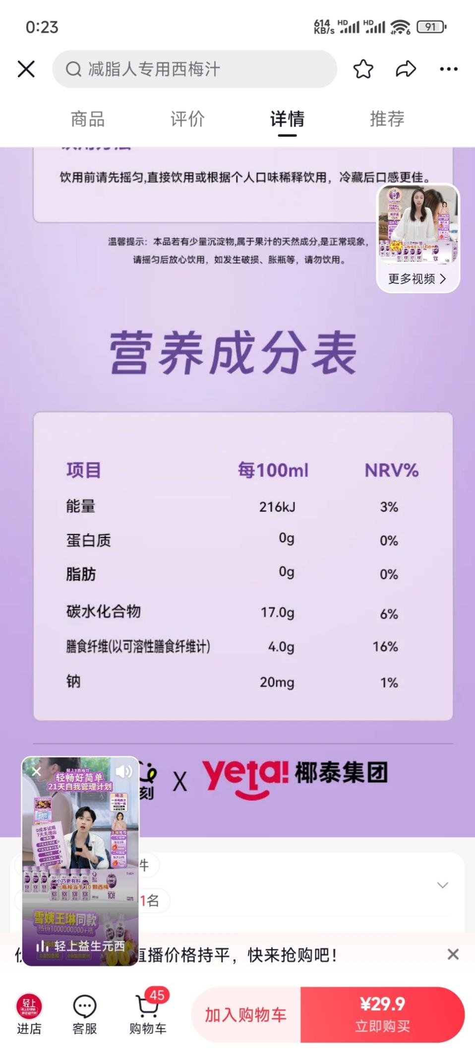 就连主打减肥人士专用的西梅汁,每100ml含糖量更是高达17g,如果按照轻上直播间推荐的一天喝两瓶(一瓶约60ml)计算,两瓶含糖量也要20.4g。
