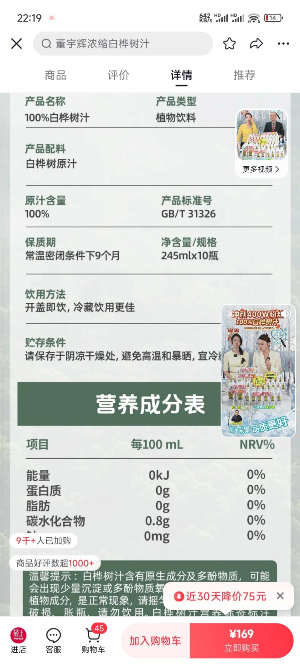 值得一提的是,翻看轻上白桦树汁的配料表,显示配料表只有白桦树汁,但成分表里却只有0.8g碳水化合物(轻上表示,达到GB 28050法规中国家标准热量≤17kJ/100mL,能量即可标注0k)。而嘉桦白桦树汁的配料表里,同样显示配料表只有白桦树汁,但成分表里却不光有1.1g碳水化合物,还有18千焦能量。且轻上白桦树汁未标明所含矿物质、氨基酸、多糖类物质及抗氧化成分的含量。