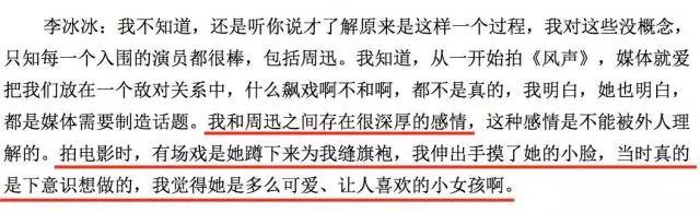 之后周迅采访中大方为李冰冰送上了祝福,并表示“但是我觉得她更需要得到鼓励。”只是这样微妙的回应实在是看不出两个人之间有多深的情谊,反而感觉字里行间都在表达着“我拿的奖已经够多了,她比较需要被证明”。