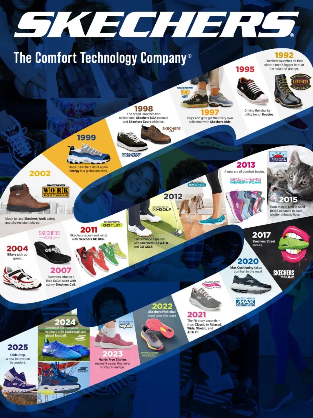 创始人罗伯特·格林伯格带着儿子迈克尔,以男士工装靴起家,创立品牌鞋履品牌“Skechers(斯凯奇)”,其名称源自南加州俚语“坐不住的年轻人”。
