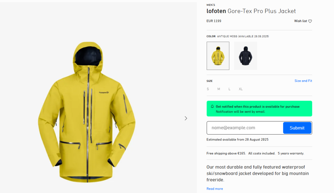 售价1199欧元/件的Lofoten夹克售罄丨截图来源于品牌官网商城