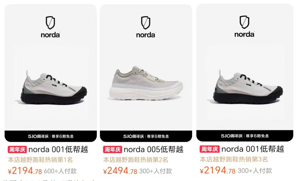 在品牌天猫旗舰店上,norda热销跑鞋价格基本在2000元左右一双,而热销第一的norda001低帮越野鞋付款人数不足700。