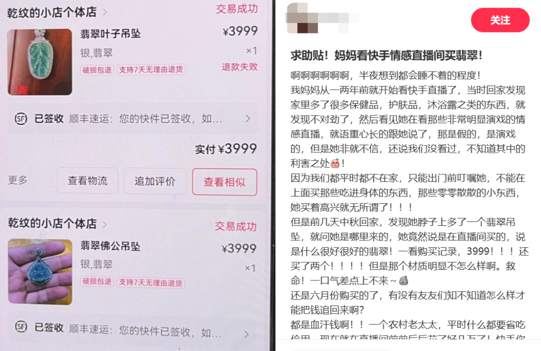 还有网友表示,父母沉迷快手上的情感主播,而翡翠又是情感主播带货的主要品类,自己母亲为了主播买翡翠吊坠前前后后已经花了几万元。