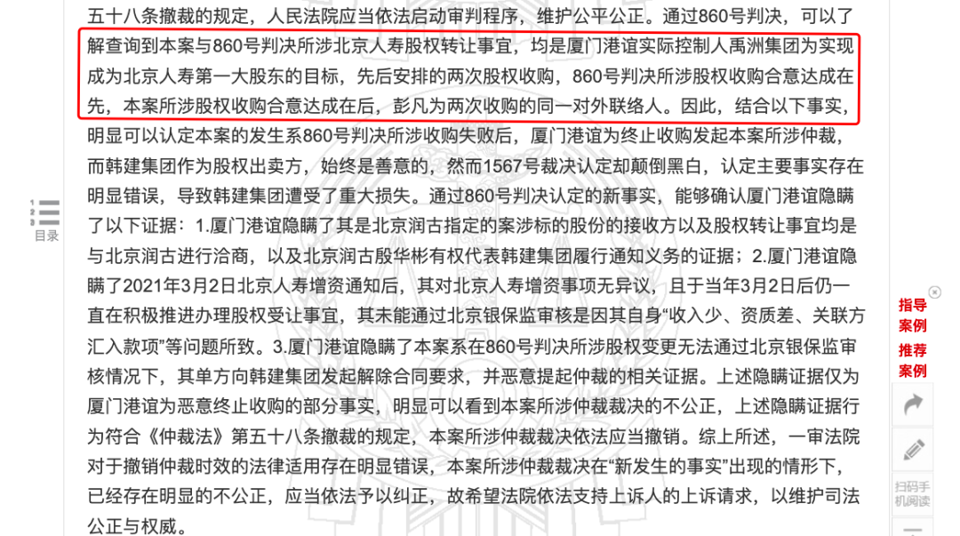 韩建集团称,港谊集团隐瞒了其收购韩建集团所持北京人寿股权,是在860号判决所涉股权变更无法通过北京银保监审核情况下,单方向韩建集团发起解除合同要求,并恶意提起仲裁的相关证据。