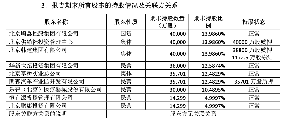 2024年末,北京人寿有九家股东单位,其中北京供销社、北京顺鑫控股集团有限公司(以下简称“顺鑫控股”)、韩建集团三家并列为第一大股东,持股比例均为13.99%。