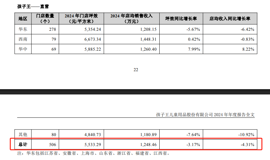 孩子王直营门店坪效数据,图源孩子王2024年财报