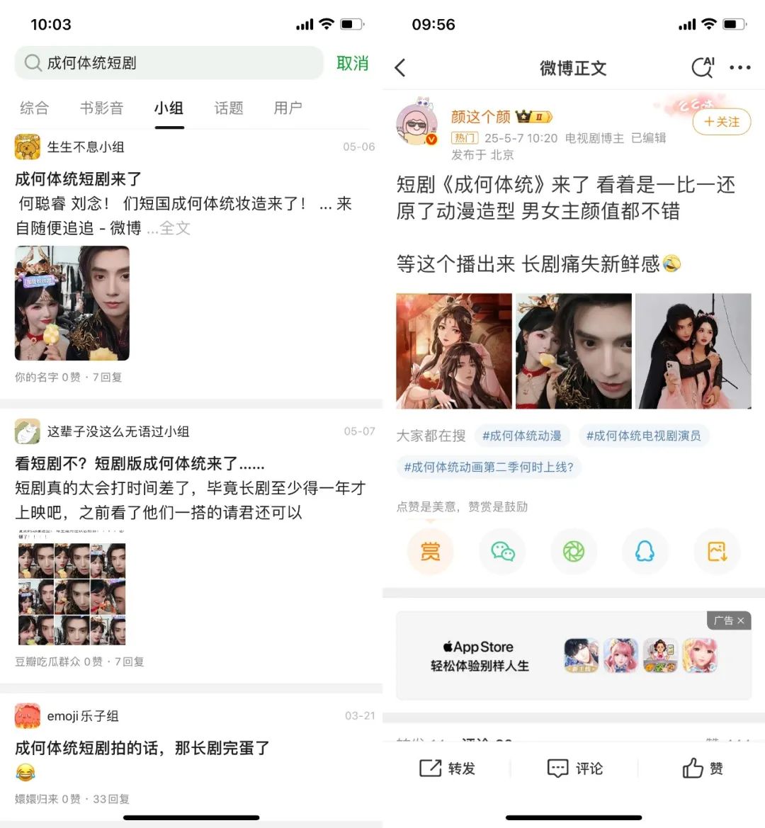 然而众所周知,同题必伴随着对比。短剧糙则糙矣,但百分百能抢跑,先把这个故事嚼一遍。更何况,《成何体统》为脑洞双穿,《不二之臣》是霸总与金丝雀,长短谁更能得原作精髓还真不好说。