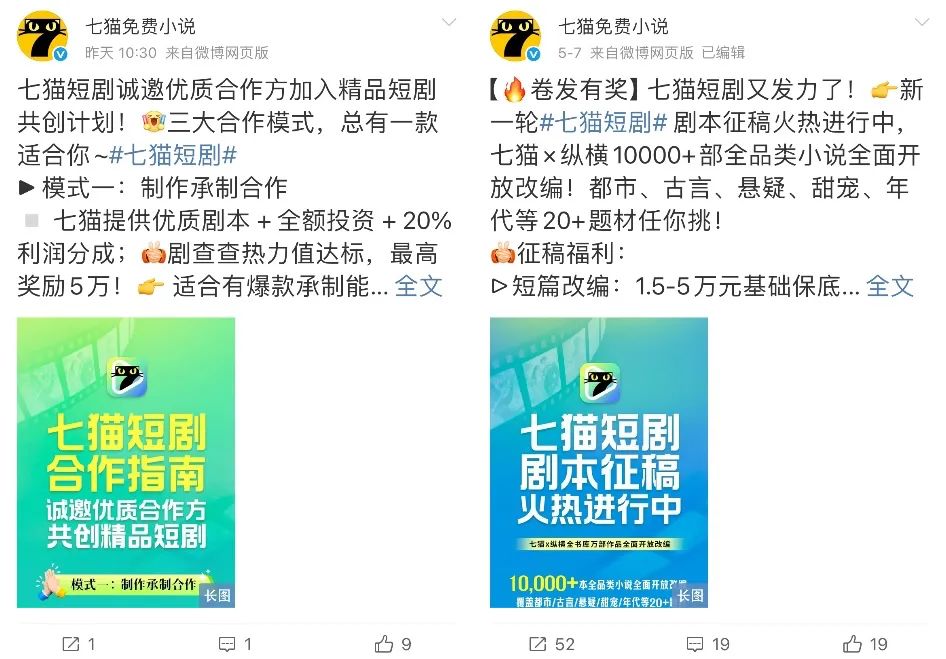 以及于5月初发起短剧剧本征稿(七猫X纵横全书库的10000+全品类小说开放改编)与面向合作方的精品短剧共创计划,独立APP也正式上架。